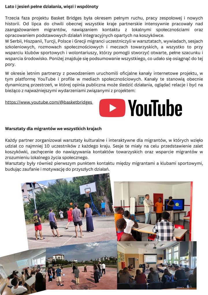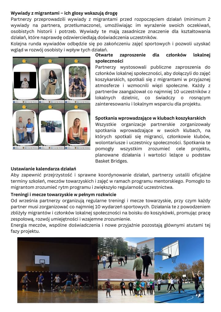 Trzecia faza projektu Basket Bridges była czasem intensywnego ruchu, współpracy i nowych historii. Od lipca do dziś wszystkie kraje partnerskie z zaangażowaniem pracowały nad włączaniem migrantów, budowaniem relacji z lokalnymi społecznościami oraz rozwijaniem działań integracyjnych opartych na koszykówce.