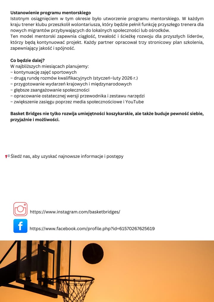 W okresie letnim partnerzy z powodzeniem uruchomili oficjalne kanały internetowe projektu, w tym platformę YouTube oraz profile w mediach społecznościowych. To dziś tętniąca życiem przestrzeń, w której można śledzić działania, oglądać relacje i być na bieżąco z wydarzeniami projektu: 👉 Basket Bridges – YouTube