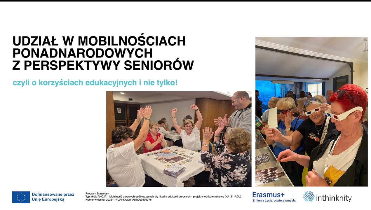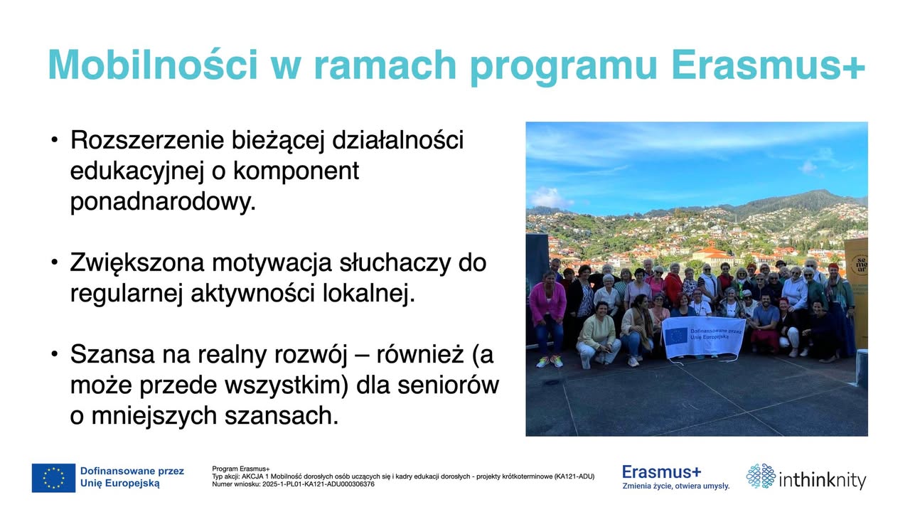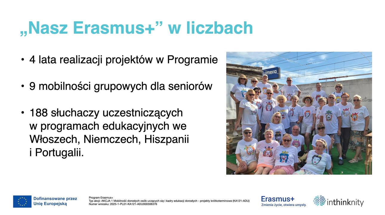 Dzisiaj mieliśmy przyjemność przedstawić krótką prezentację w ramach spotkania Klubu Europejskich Pasjonatów. Opowiadaliśmy o tym, jakie korzyści przynoszą naszym seniorom mobilności ponadnarodowe w ramach Erasmus+ Edukacja dorosłych! A okazało się, że zdecydowanie jest o czym mówić – 4 lata, 9 mobilności grupowych i aż 188 słuchaczy, którzy wzięli udział w programach edukacyjnych we Włoszech (Centro Studi di Cultura Europea) w Niemczech (VFBQ Bad Freienwalde e.V.), w Hiszpanii (Beehive Blue) oraz w Portugalii (ARTE.M cultural association on Madeira island). Mamy świetne organizacje przyjmujące, ale też i świetnych beneficjentów – i to właśnie jest realne wsparcie Unii Europejskiej dla edukacji dorosłych.