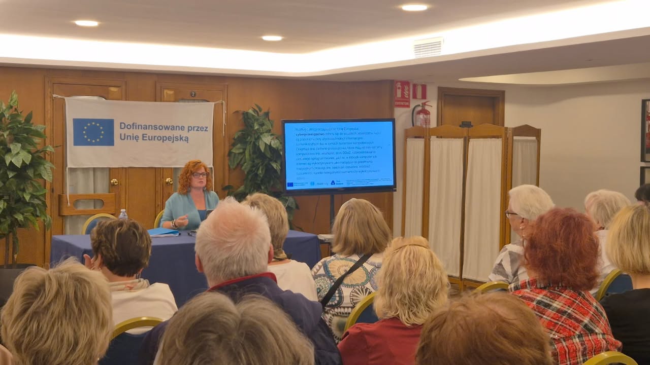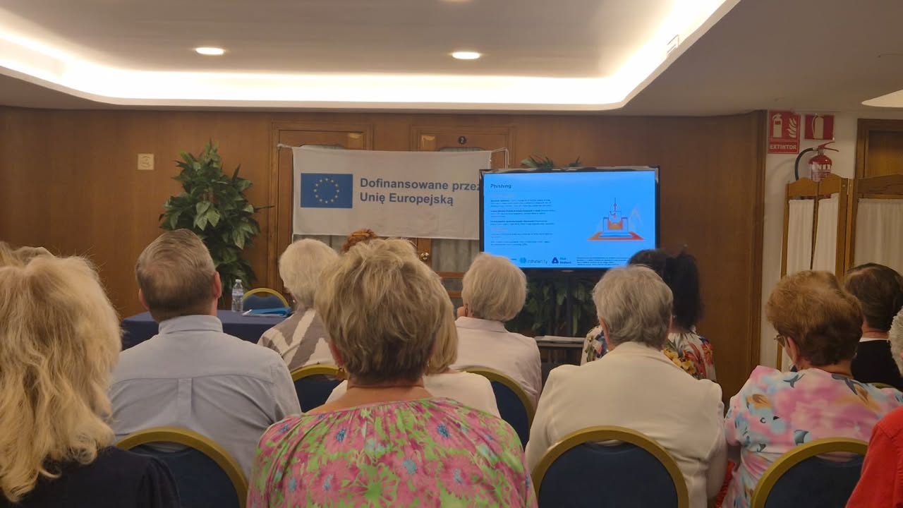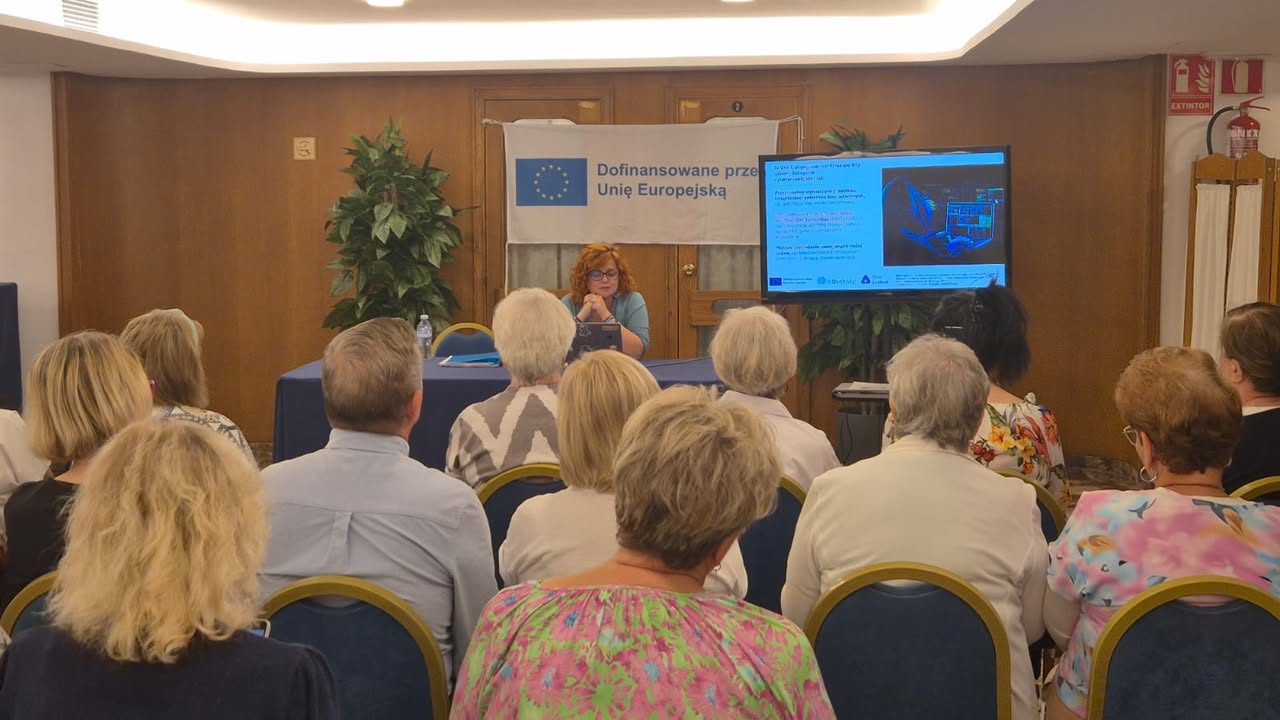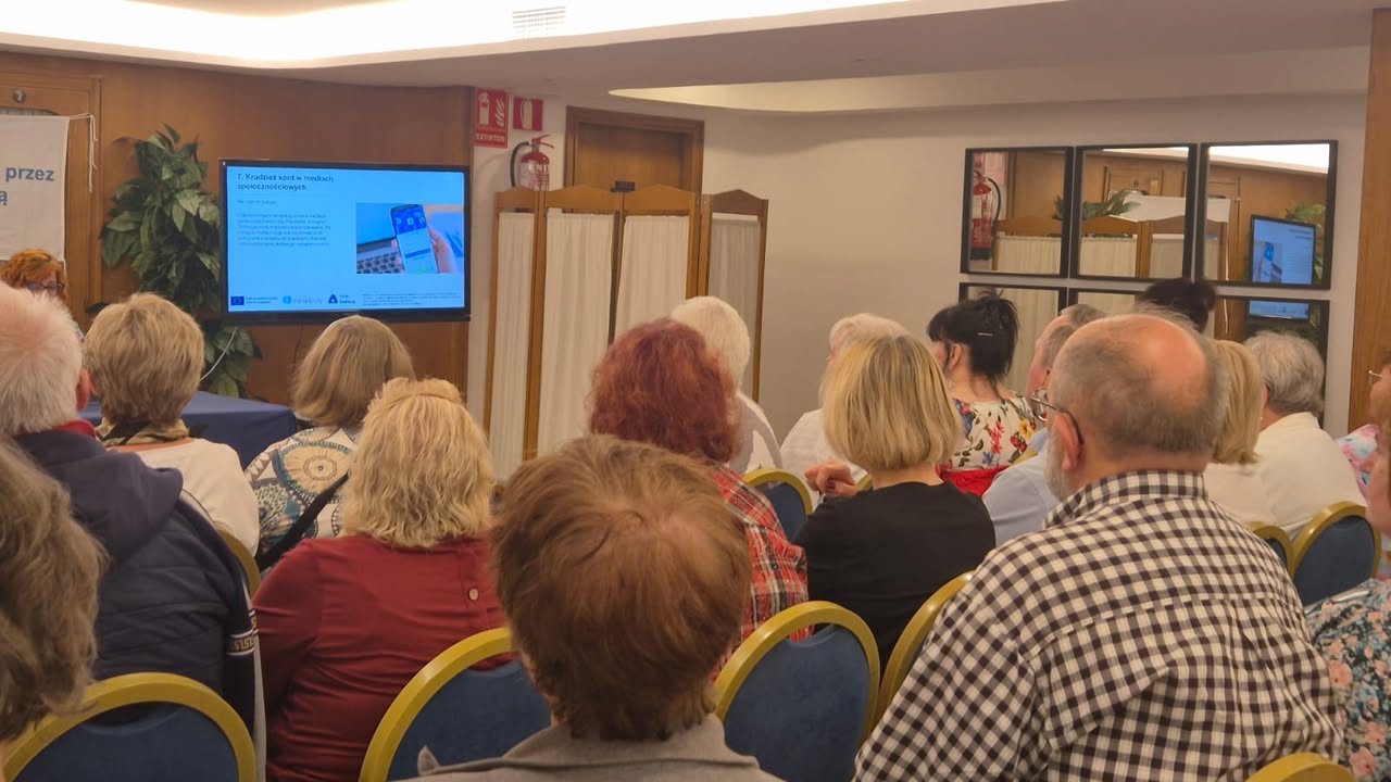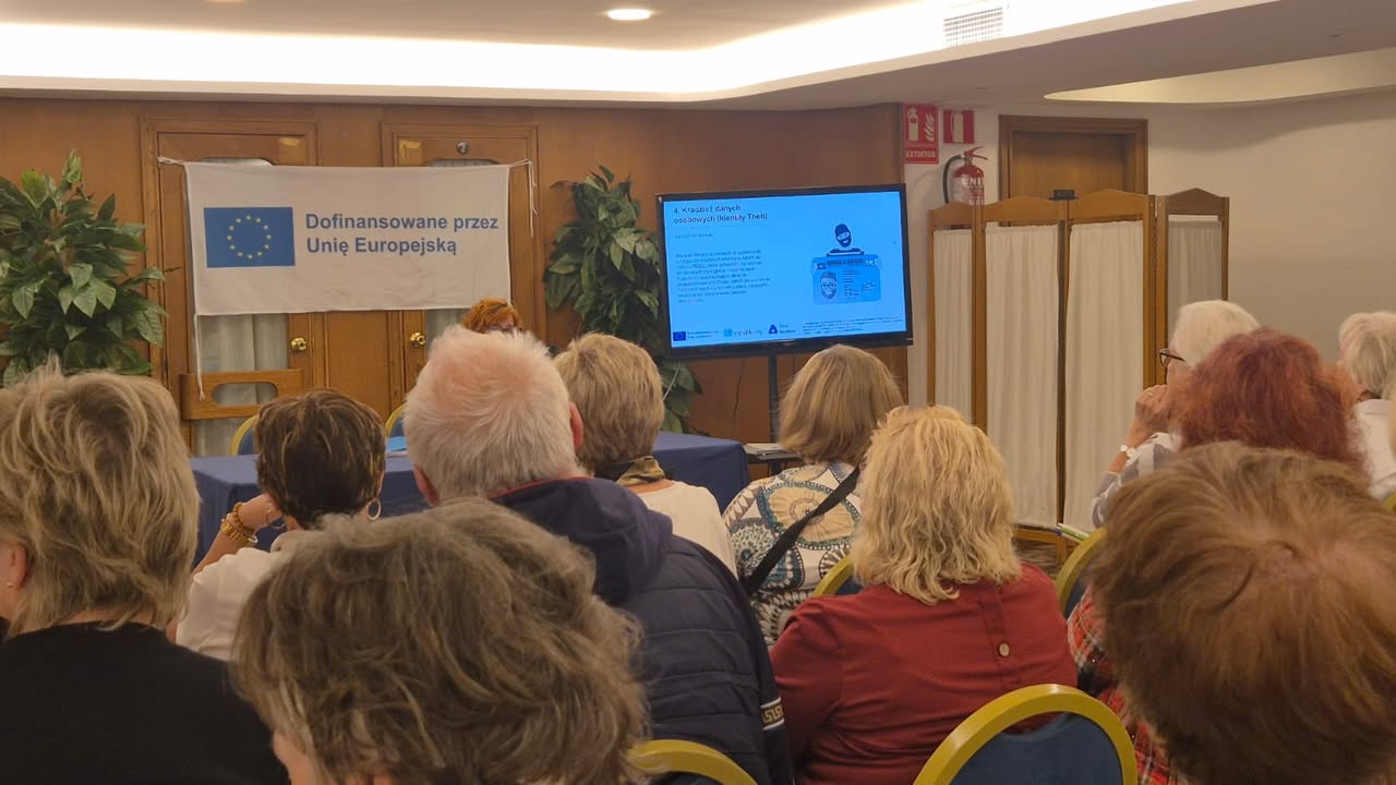 Po południu uczestnicy wysłuchali prezentacji „Normy prawne w pracy z AI”, poznając podstawowe regulacje dotyczące ochrony danych, praw autorskich i etyki w cyfrowym świecie. Kolejnym punktem programu były warsztaty „Ochrona danych osobowych w pracy z AI” – niezwykle ważne w kontekście bezpieczeństwa cyfrowego seniorów.