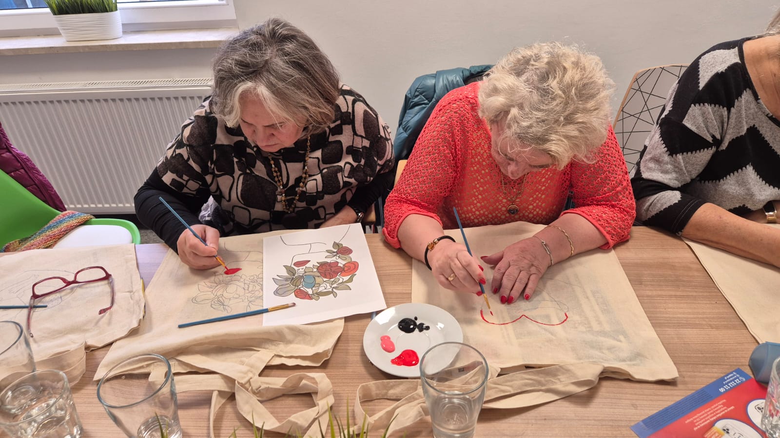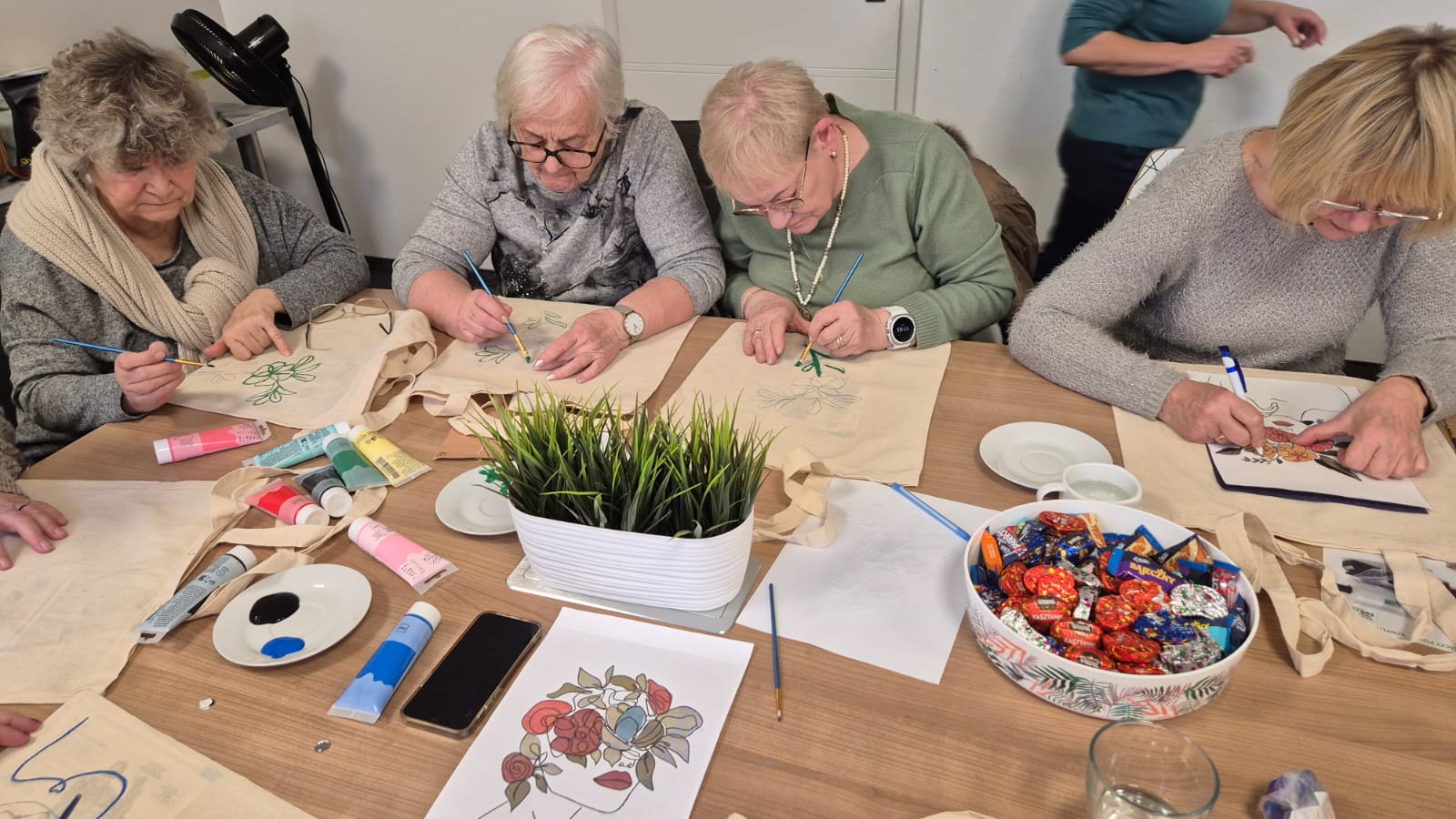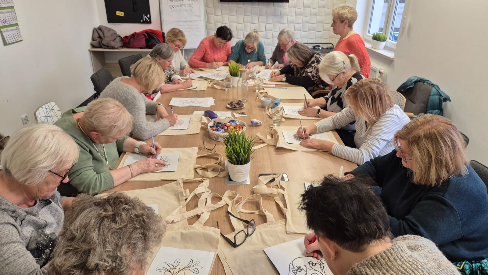 Spieszymy z relacją z pierwszych z trzech zaplanowanych warsztatów artystycznych! Dzisiaj nasze Seniorki stworzyły własne torby bawełniane – efekty ich pracy na zdjęciach.